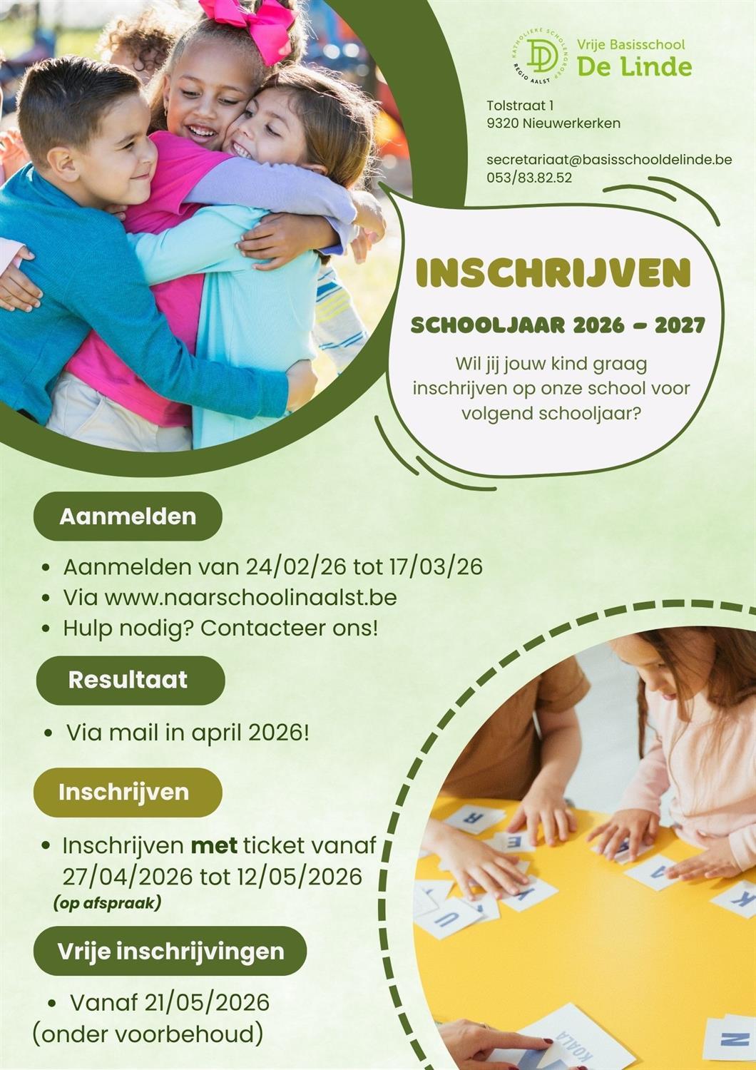 Je kind(eren) aanmelden kan via: www.naarschoolinaalst.be tijdens de aanmeldingsperiode. (Deze periode kan je steeds terugvinden op onze schoolwebsite, communicatiekanalen of bij het secretariaat van onze school).