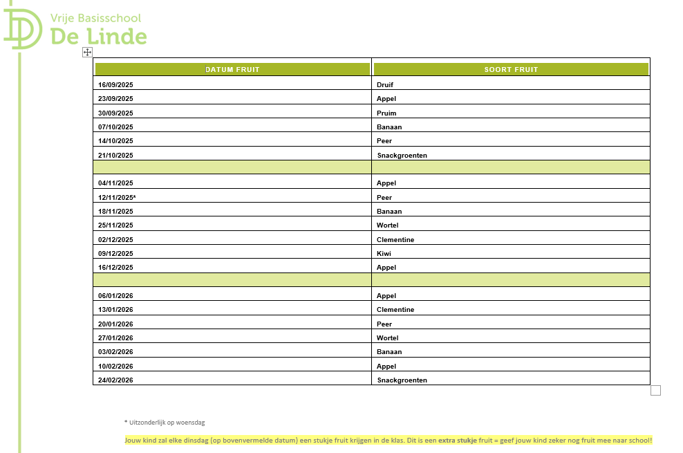 Op de kalender hieronder kunnen jullie precies zien welk fruit er die week op het menu staat. Zo weten de kinderen (en ouders) alvast waar ze zich op kunnen verheugen!